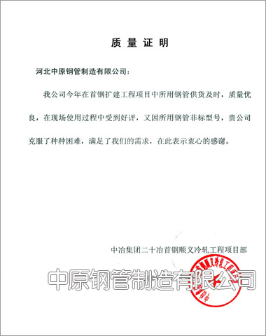 中冶集團(tuán)二十冶首鋼順義冷軋工程項(xiàng)目部業(yè)績(jī)證明